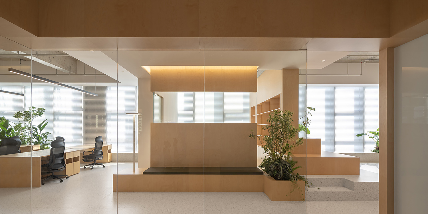为了让空间存在点燃自然之力,离不开光照景观的光与影的朴素、温暖氛围。一个健康的舒适办公空间,需要物理环境更为细致的表面情感传递,例如此处为了唤醒自然光线的光影交错之美,位置、光线、机理是勾勒出轮廓的关键因素。